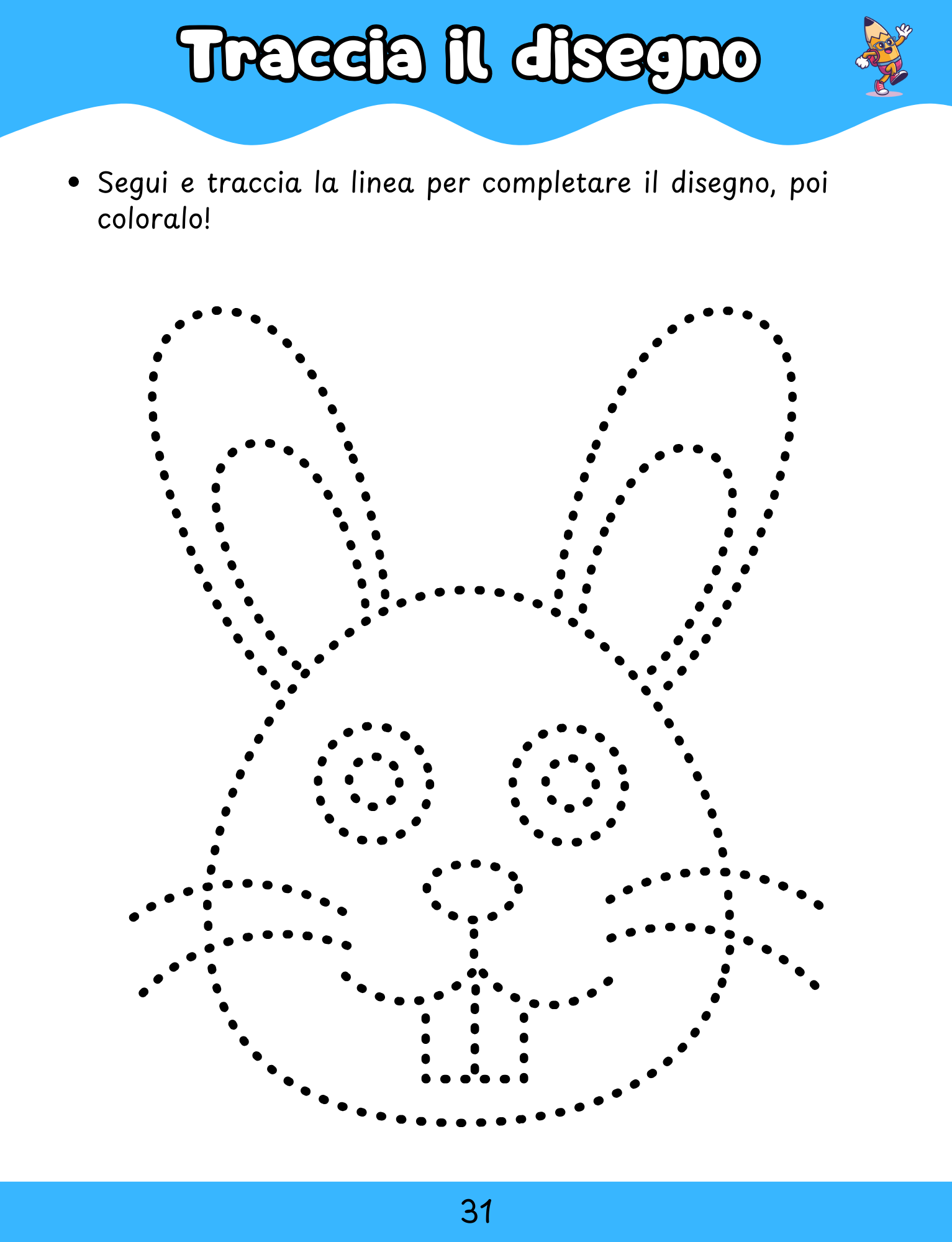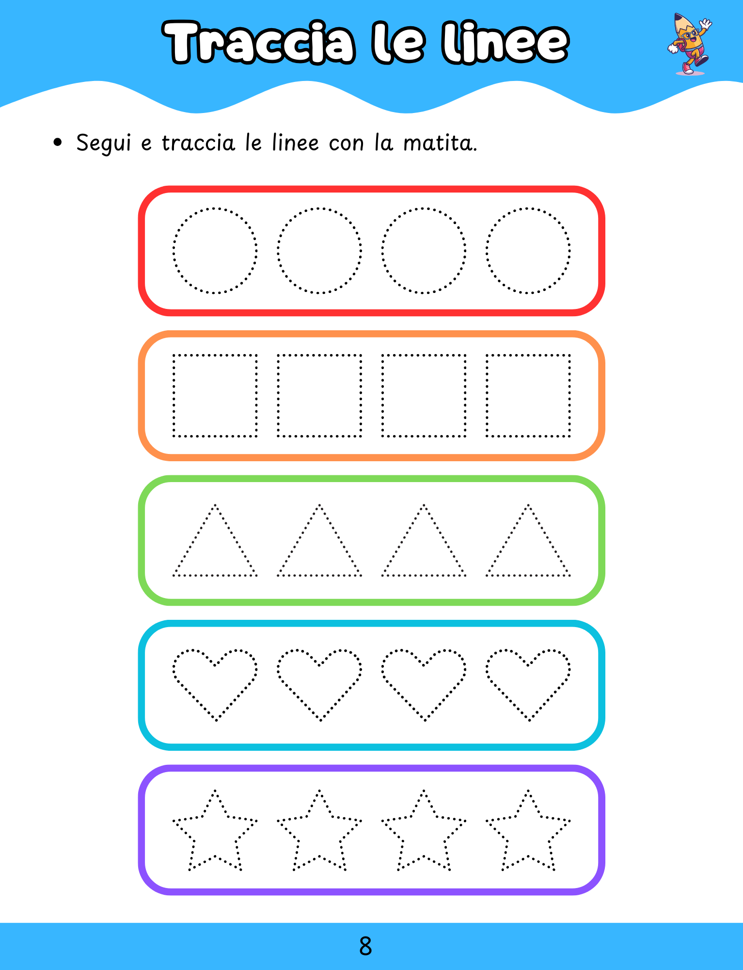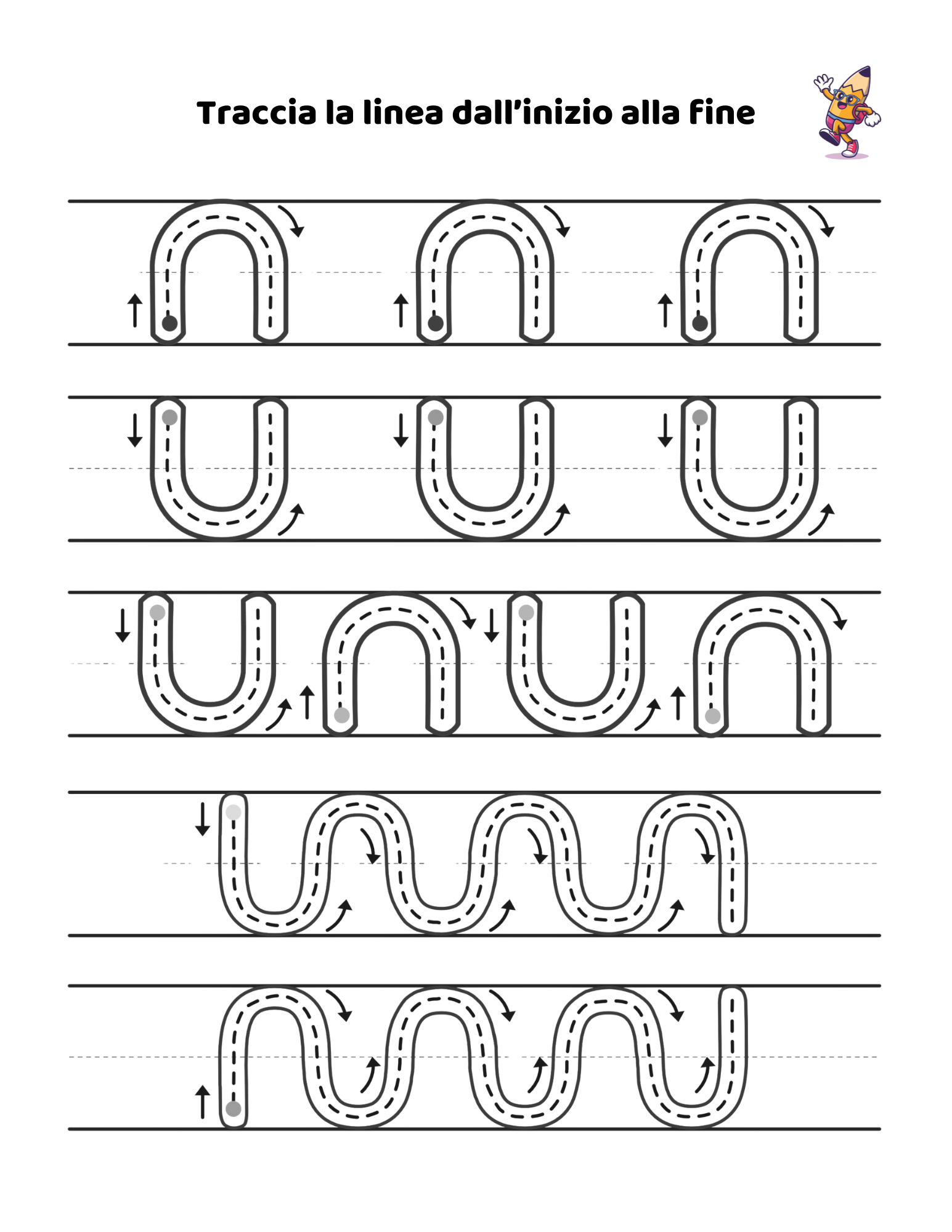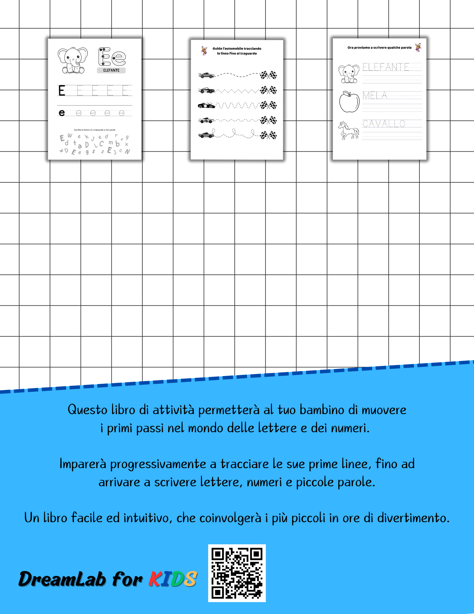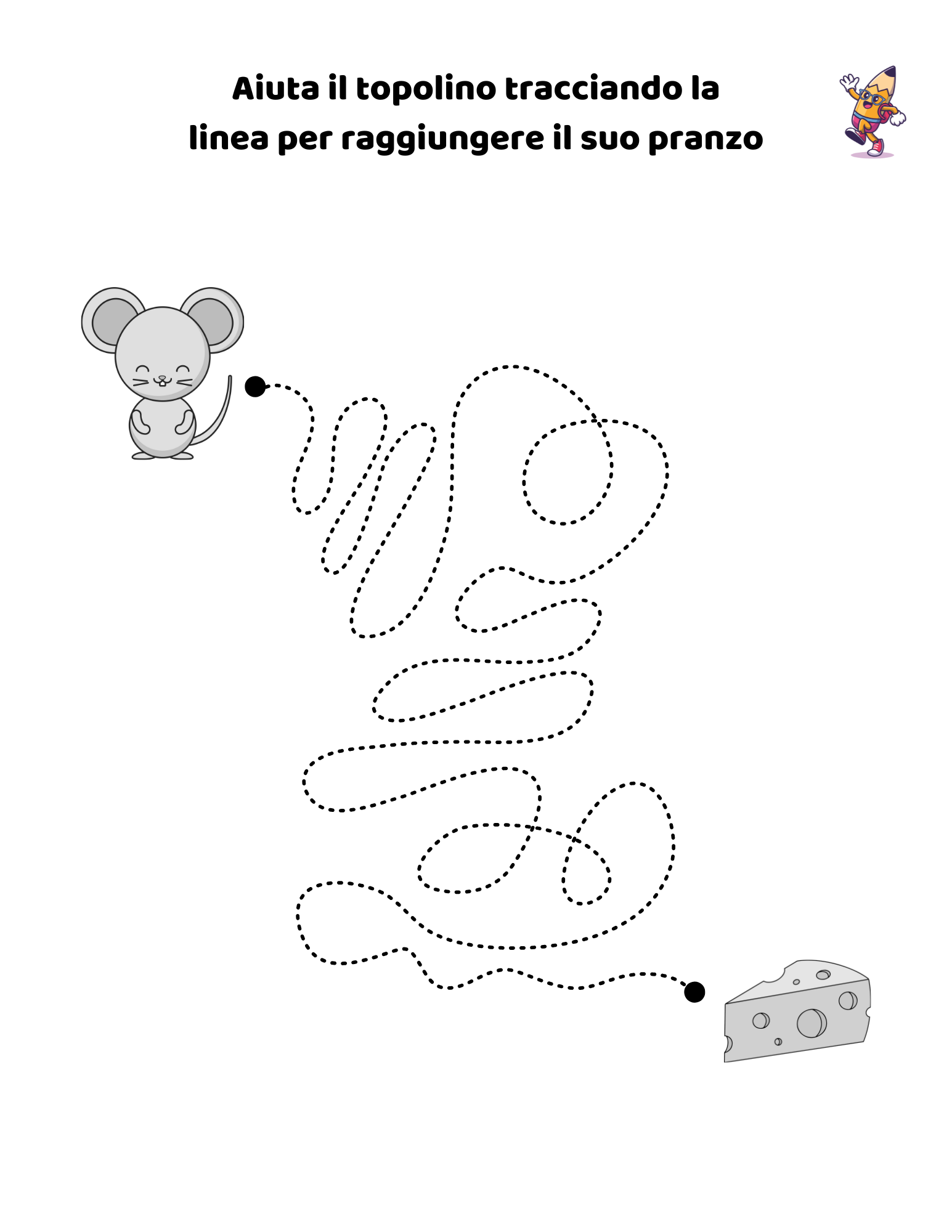 - Grafomotoria, per sviluppare coordinazione e abilità di pregrafismo attraverso tracce e disegni guidati.
