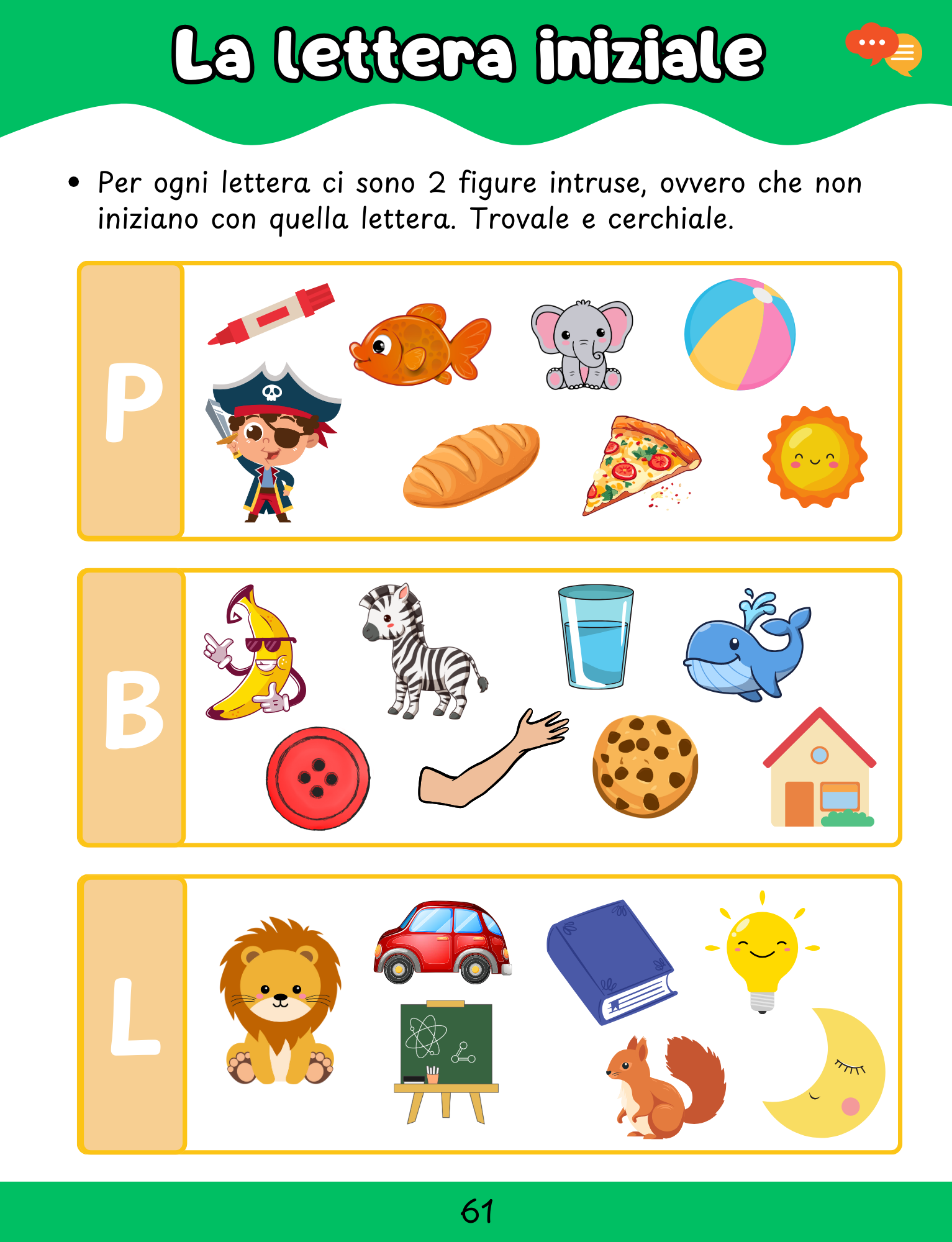 - Linguaggio, per familiarizzare con lettere, parole e prime esperienze di lettura.